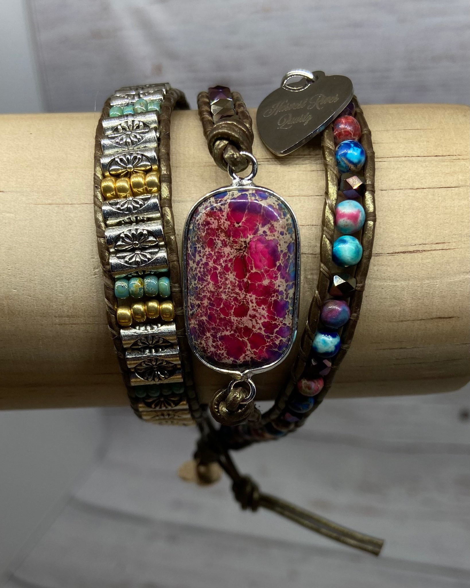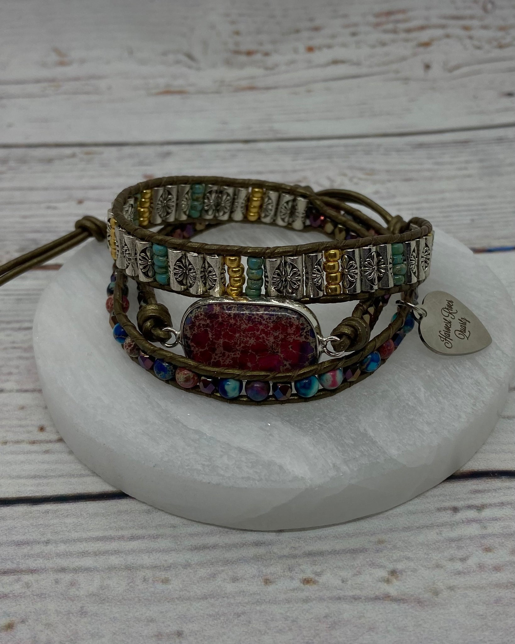 Boho Two Wrap Leather Crystal Beads, Jasper Natural Stone Connector and Imperial Jasper Gem Stone Beads